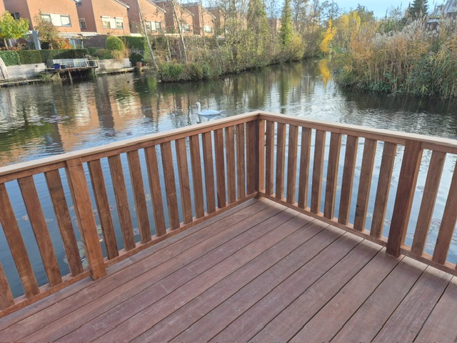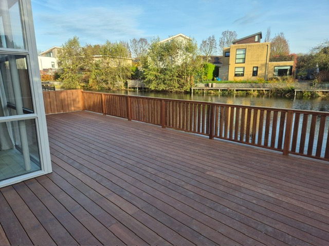 een royale hardhouten vlonder die naadloos aansluit op de rustige omgeving aan het water.